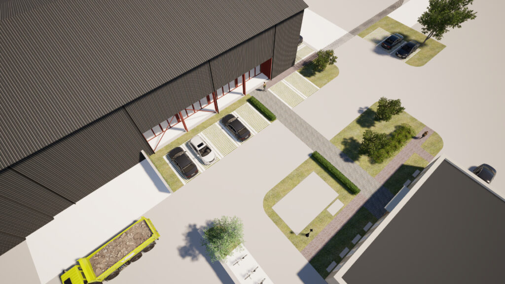 Op het bedrijventerrein Haven in Waalwijk staat momenteel een vervallen loods. Wij hebben een ontwerp gemaakt voor een nieuwe zwarte omkleding van de hal. In de loods komt een 2-laags volume met multifunctionele ruimtes. Tevens wordt het terrein tussen het bestaande kantoor en de loods heringericht i.s.m. Studio REDD. Zo krijgt een versteende plek op het bedrijventerrein een groene en toekomstbestendige uitstraling.